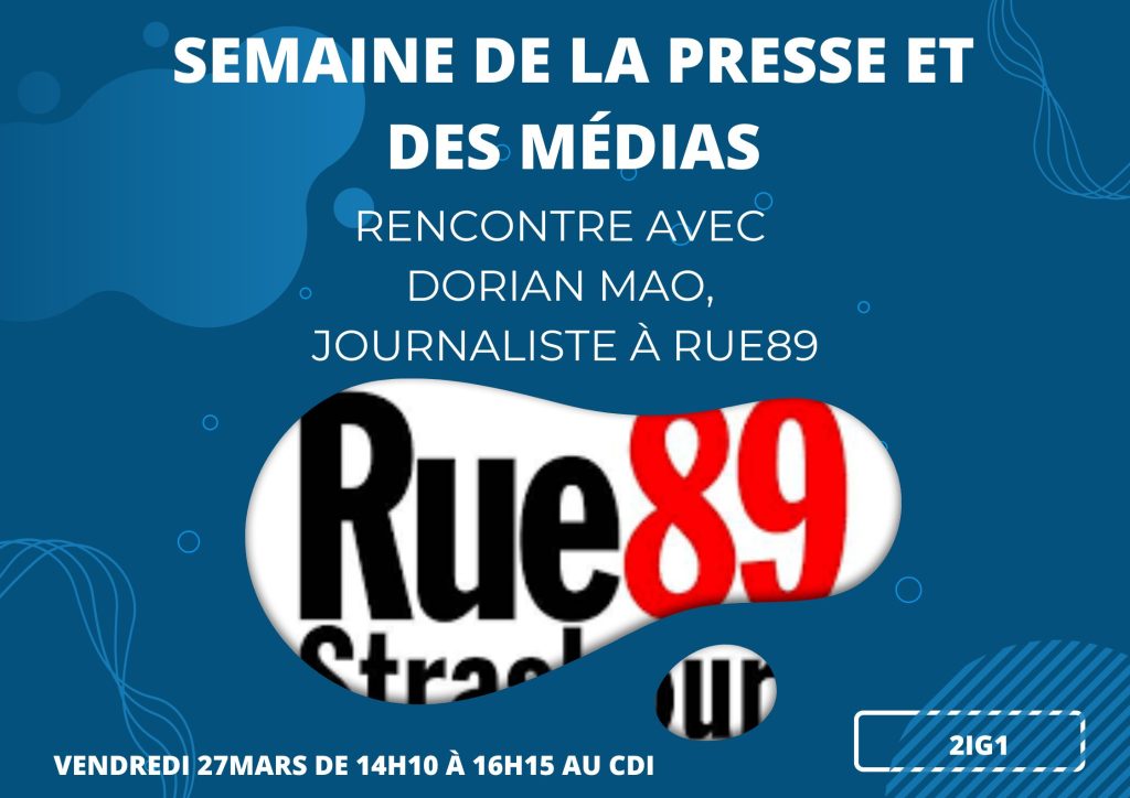 Vendredi 27 mars, la classe de 2IG1 a poursuivi son éducation aux médias en rencontrant Dorian Mao, journaliste pigiste spécialisé dans les questions d’écologie pour différents médias, entre autres Rue 89. Il leur a parlé franchement de son métier, des difficultés, de son parcours ainsi que des nouvelles problématiques qui peuvent émerger à l’heure actuelle. Une rencontre enrichissante et salutaire.
